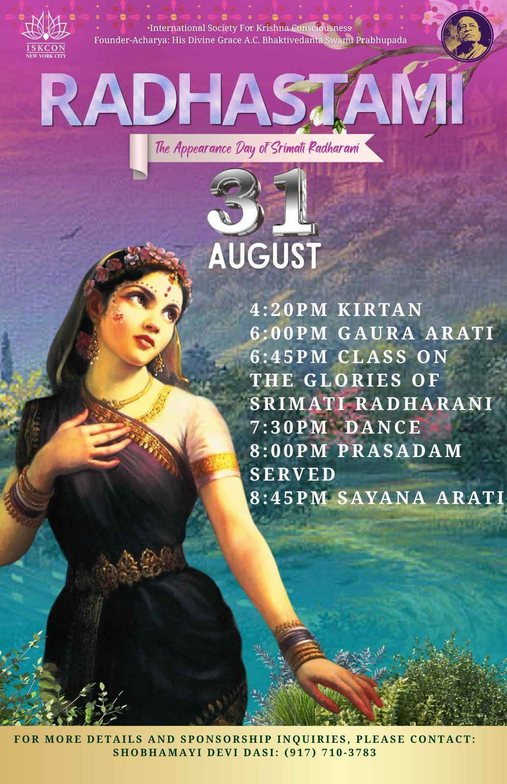 On Sunday, August 31, we will celebrate Radhastami, the most auspicious appearance day of Srimati Radharani. Please review the sponsorship opportunities available for this special day and guarantee the pleasure of, and reciprocation from, Sri Radha eternally.
